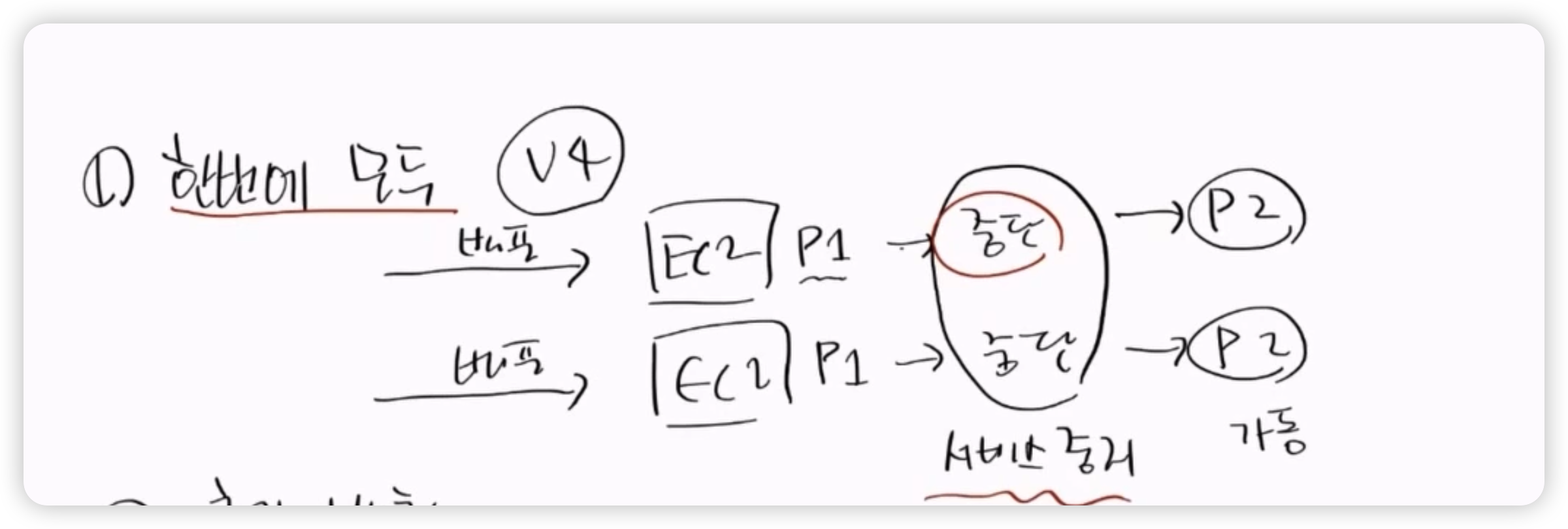 하지만 이 방식엔 문제점이 존재하는데 새 서버엔 배포성공했지만 이전 서버에 에러가 발생하는 경우 롤백에 시간이 걸리고 효율성이 떨어지게 됩니다.