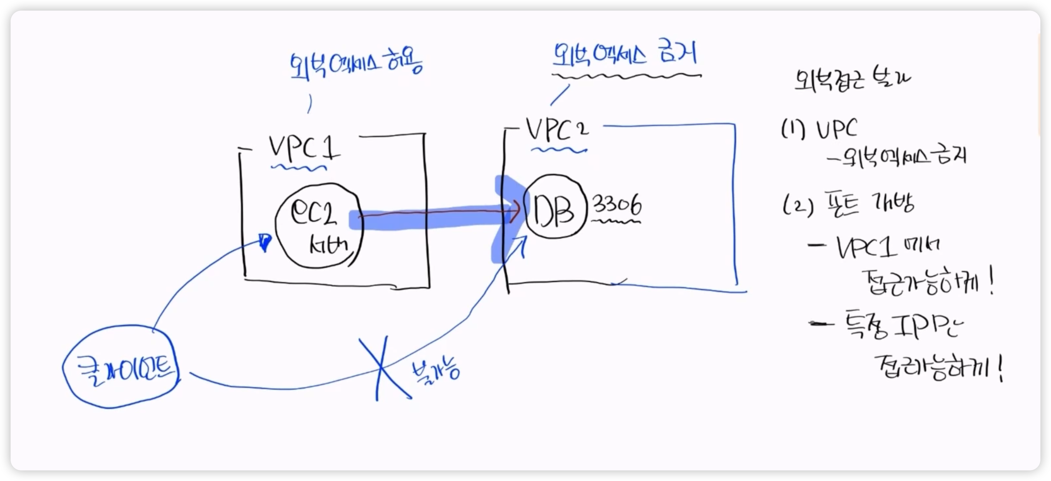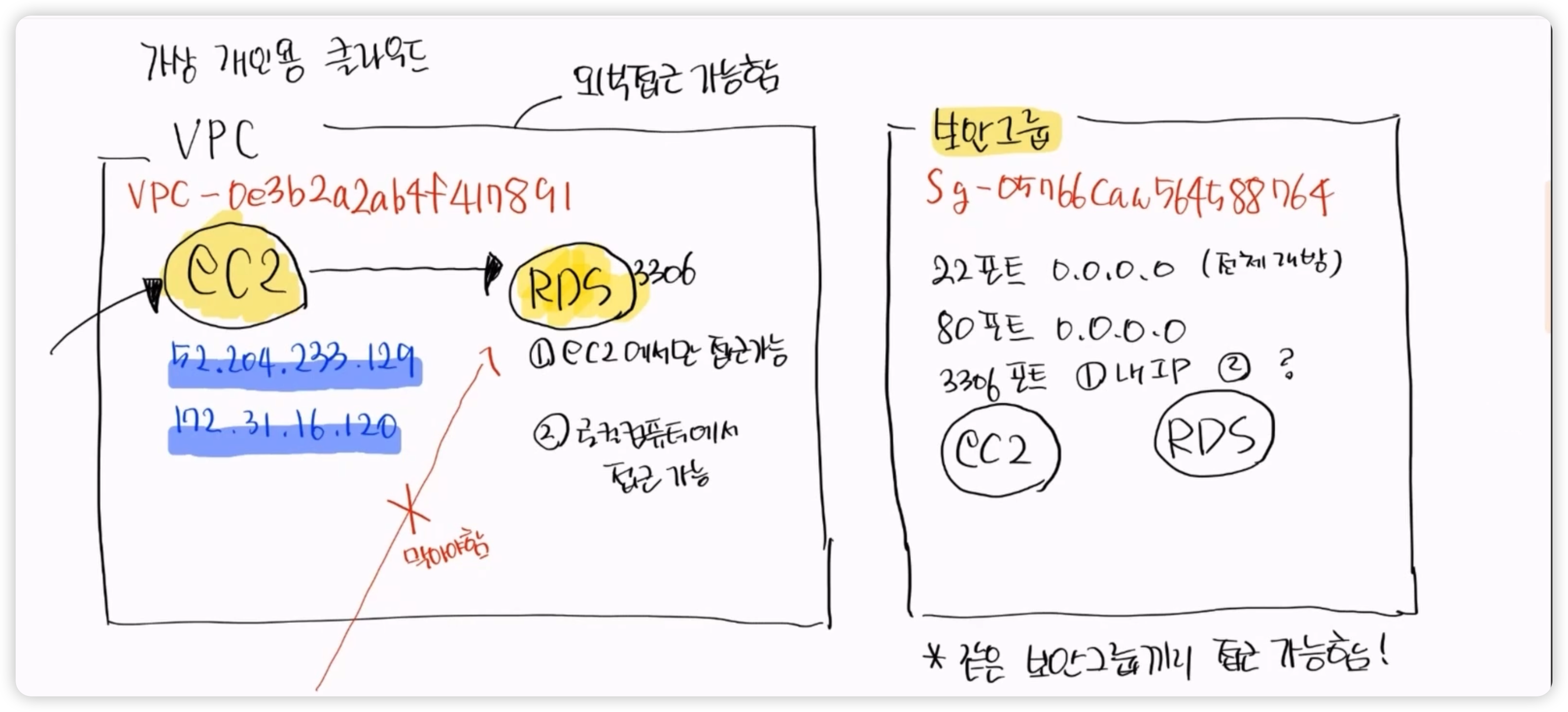 EC2의 보안그룹에서만 RDS로 접근할 수 있도록 RDS의 접근 규칙을 EC2 보안그룹으로 설정해두는 것입니다.
