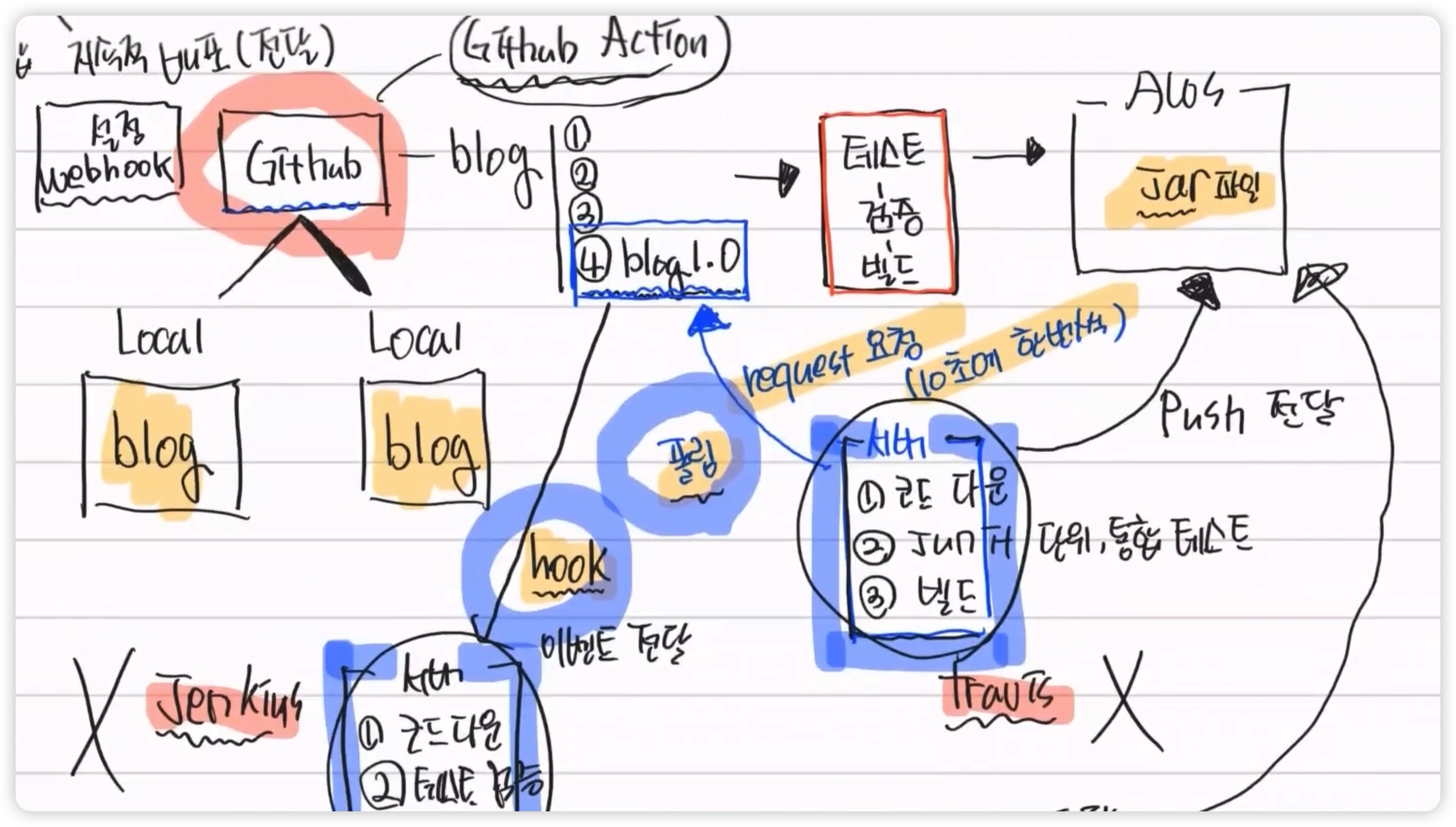 정리를 하면 로컬에서 커밋을 하게되면 Github에서 변경감지가 일어나게 되고 CI서버로 CD를 하게 됩니다.