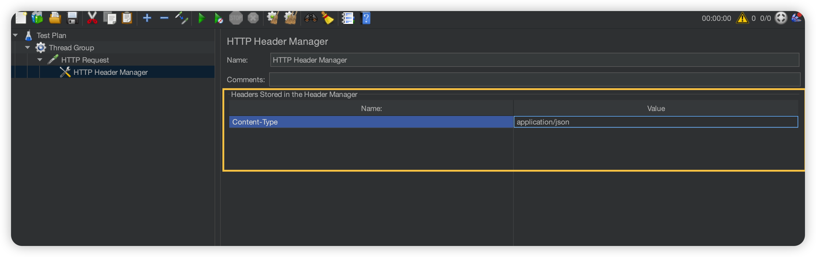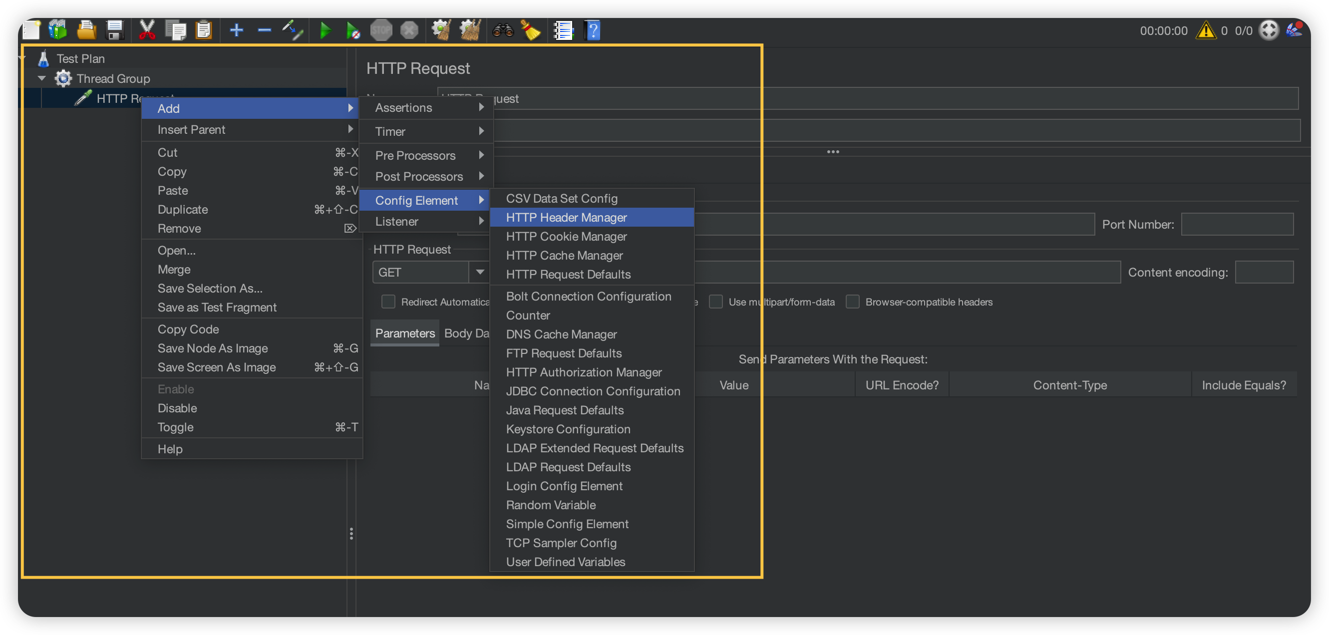 5. 헤더에 정보를 추가하기 위해 HTTP Header Manager를 생성해주고, 필요한 속성들을 추가해준다.