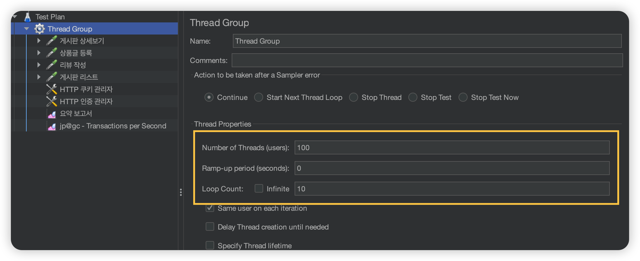 이렇게 설정하면 쓰레드 100, Ramp-up 0 , 루프 카운트 10 이면 100명이 0초에 10번씩 요청해서 총 1000번의 요청이 전송됩니다.